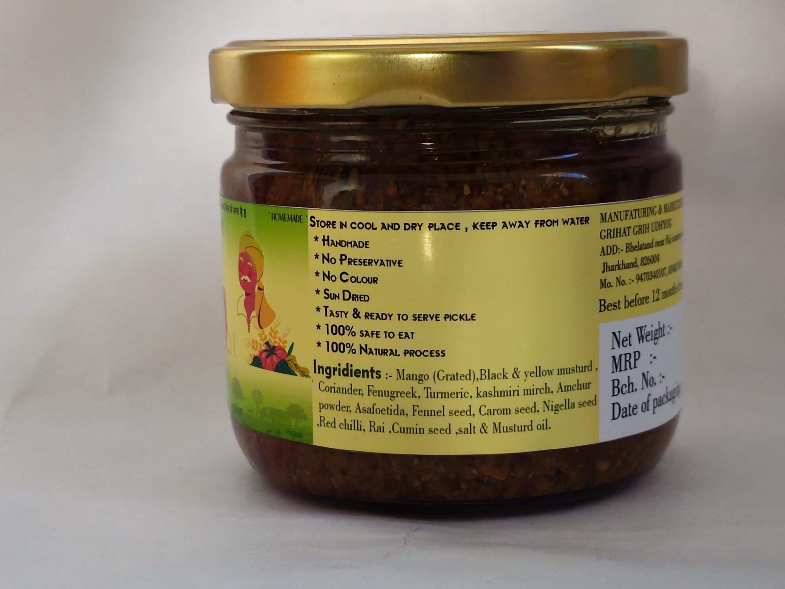 Ingredients :- Mango,Coriander,Fenugreek,Turmeric, Asafoetida,Fennelseed,Caromseed,Nigellaseed, Redchilli,Cuminseed,Blacksalt,salt & Musturd oil.